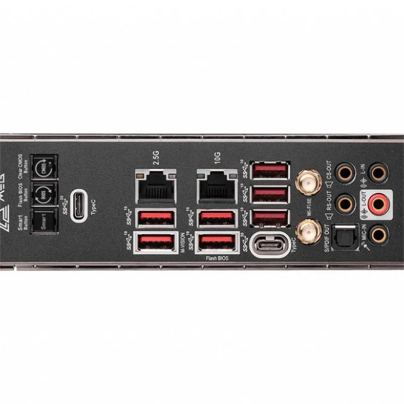 | Cổng mặt sau | Nút xóa CMOS Nút Flash BIOS Mạng LAN 2,5G 10G Siêu LAN USB 3.2 Thế hệ 2 10Gbps (Loại A) Wi-Fi / Bluetooth Kết nối âm thanh HD Nút thông minh USB 3.2 thế hệ thứ 2 2x2 20Gbps (Loại-C) USB 3.2 Thế hệ 2 10Gbps (Loại A) USB 3.2 Thế hệ 2 10Gbps (Loại A) USB 3.2 thế hệ thứ 2 2x2 20Gbps (Loại-C) Ngõ ra S / PDIF quang học |
